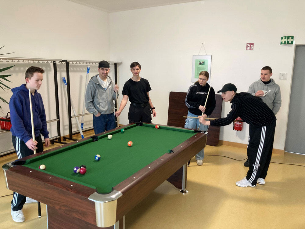 Um in Pausen, Hohlstunden oder auch im Anschluss an den Unterricht eine weitere, schöne Alternative zu den Kontakten in den Sozial-Media-Foren zu haben, wurde auf Anregung der Schulsozialarbeit mit Unterstützung des Landratsamtes und des Fördervereins der Philipp-Matthäus-Hahn-Schule ein Billardtisch beschafft. Wie dafür geschaffen ist der Standort für den neuen Tisch im 2. OG vor der Aula, da hier genügend Platz ist und während des Spielens auch kein Unterricht beeinträchtigt wird. Einige Schülerinnen und Schüler sowie Mitglieder des Kollegiums haben den Tisch inzwischen bespielt und für gut befunden. Queues und Kugeln liegen jederzeit für Interessierte im Büro der Schulsozialarbeit bereit und warten darauf, von möglichst vielen ausgeliehen zu werden.